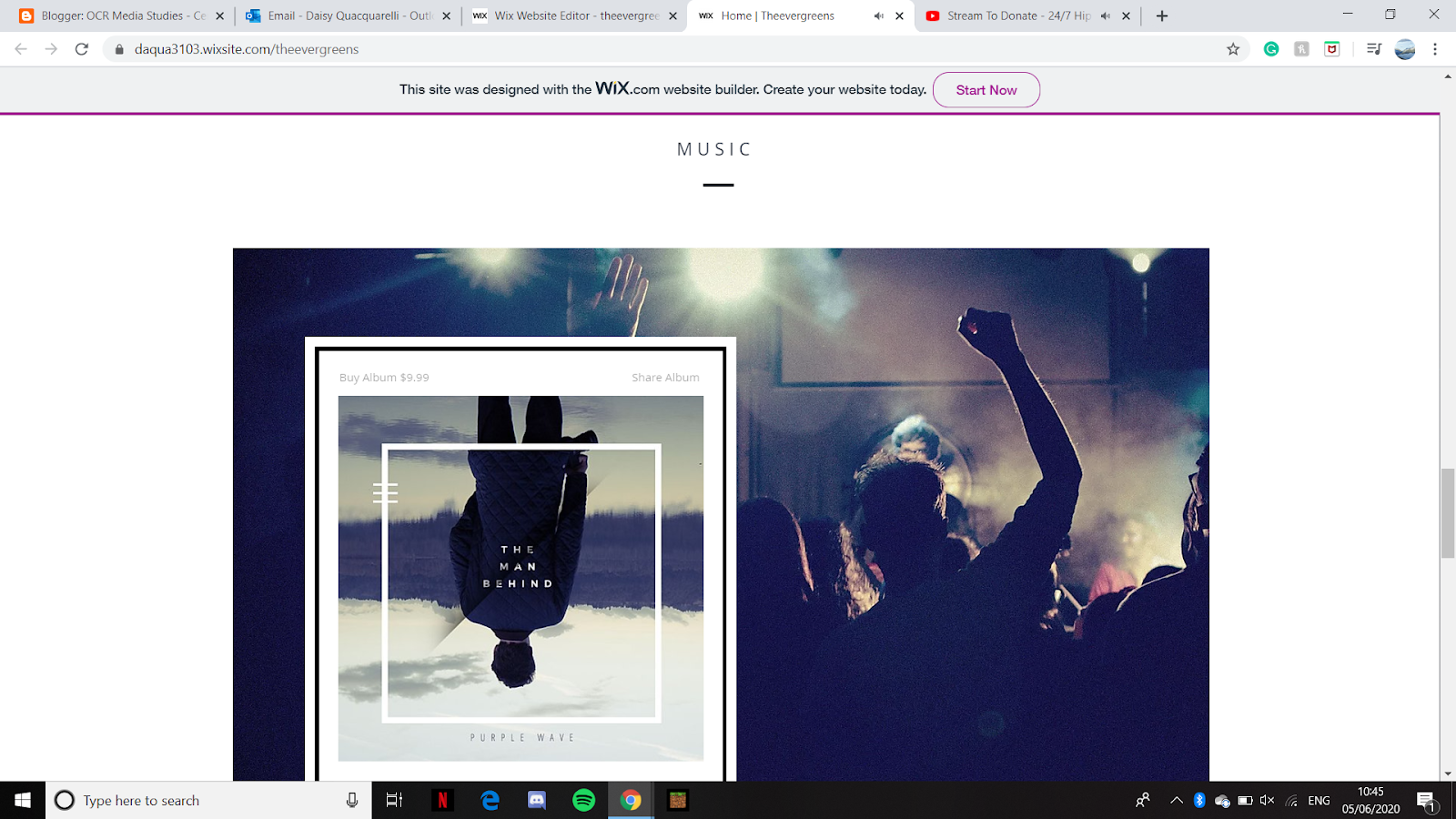 - The music section would link to the band's Spotify and lists their newest album with all the new songs. It also lists the retail price and gives the audience the opportunity to share the album, creating this idea of an active audience.